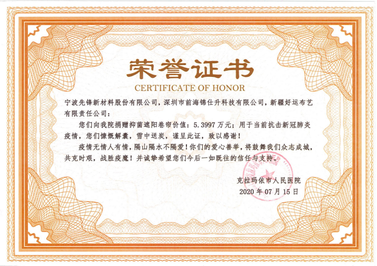 克拉玛依市人民医院对三家公司的慷慨捐赠表示感谢,并表示:“这些抑菌遮阳卷帘将极大地帮助我们改善医疗条件,保护医护人员和患者的安全。我们对深圳市前海锦仕升科技有限公司、宁波先锋新材料股份有限公司和新疆好运布艺有限责任公司的善举表示衷心的感谢。”